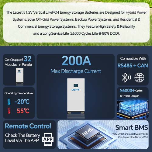 The Latest 51.2V Vertical LiFePO4 Energy Storage Batteries are Designed for Hybrid Power Systems, Solar Off-Grid Power Systems, Backup Power Systems, and Residential & Commercial Energy Storage Systems. They Feature High Safety & Reliability and a Long Service Life (≥6000 Cycles Life @ 80% DOD).