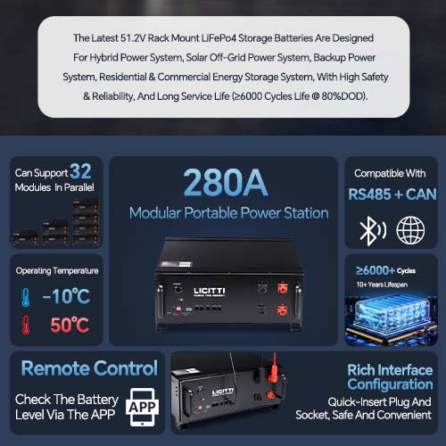 LICITTI 51.2V rack mount battery has different capacities, 2560Wh 5120Wh 10240Wh 14336Wh, ome energy storage solar off-grid system,intelligent BMS.