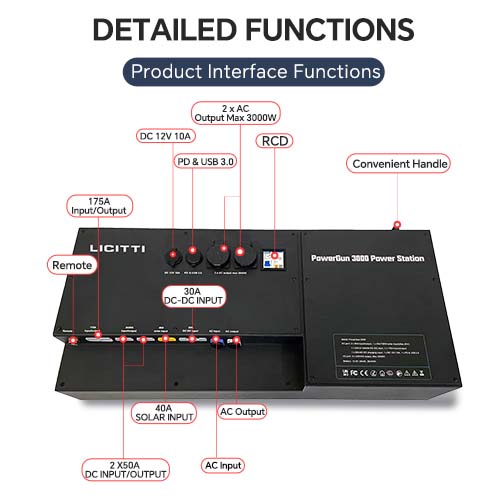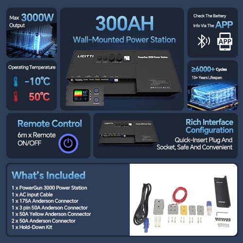 12.8V 300Ah LiFePO4 Battery With Max 1C Rate Charging And Discharging Current(300A). Max 3000W Continuous AC Output To Power Microwaves, Coffee Machines, Cooktops And More.Charing Via Vehicle Input(30A, 12-36V) And Solar Input (40A, max 90V/700W Input) Simultaneously. 175A Anderson Connector For High-Current DC Input/Output.